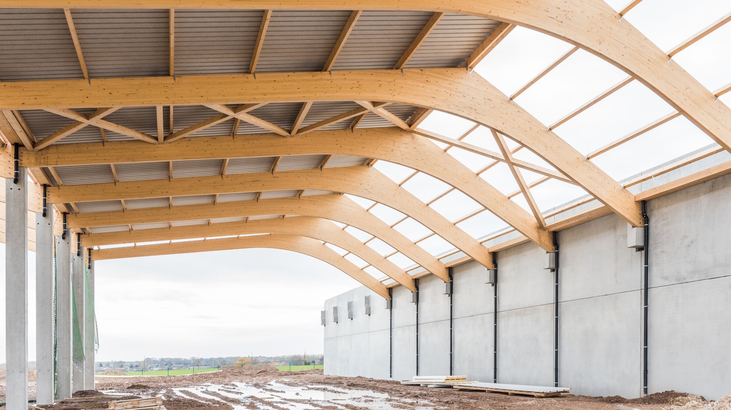 Maar de liggers konden net zo goed in hout voorzien worden. We kozen met veel plezier voor asymmetrische gelamelleerd gelijmde spanten. In aanvulling werden massief houten gordingen en houten windverbanden voorzien. Met overspanningen tot 26 m ontstaan kolomvrije ruimtes die veel invulmogelijkheden laten, ook voor mogelijk toekomstige andere gebruikers.